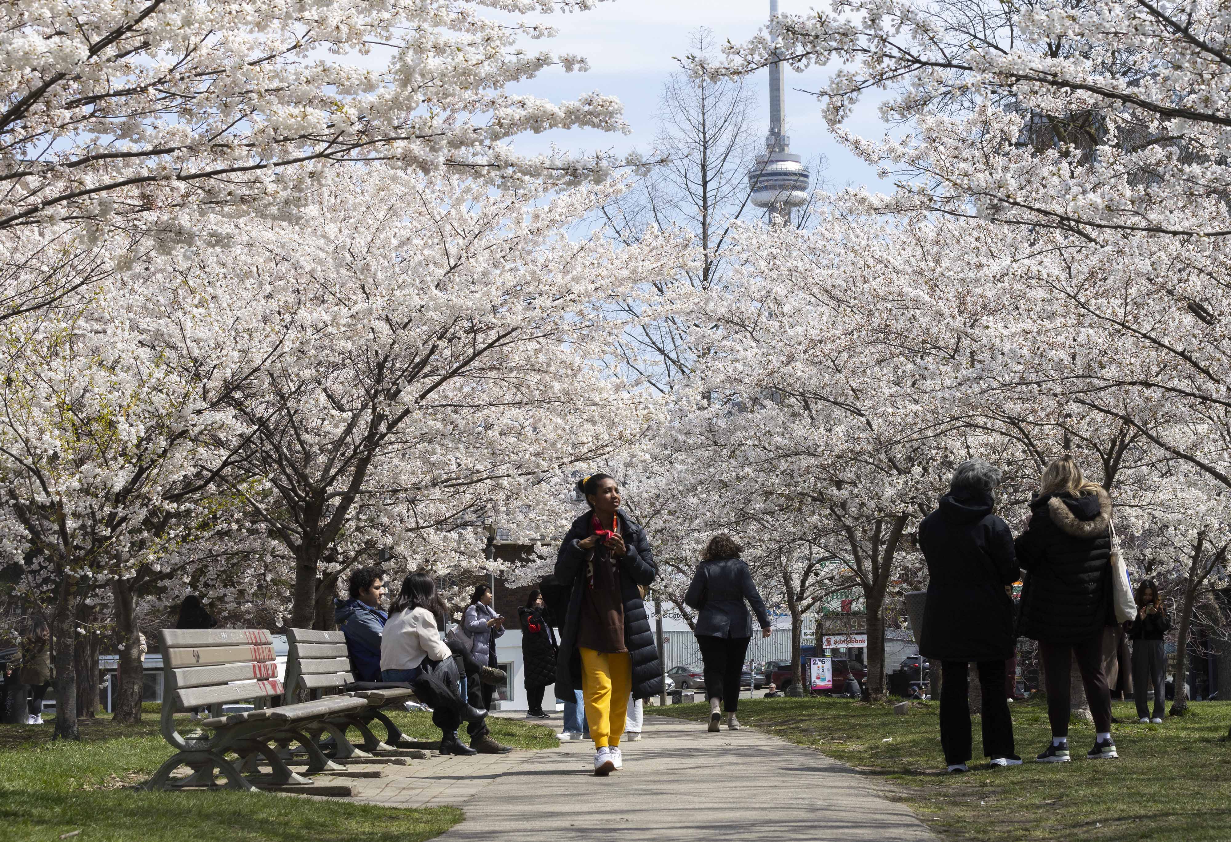 4月20日,人们在加拿大多伦多一处公园观赏樱花。新华社发(邹峥摄)